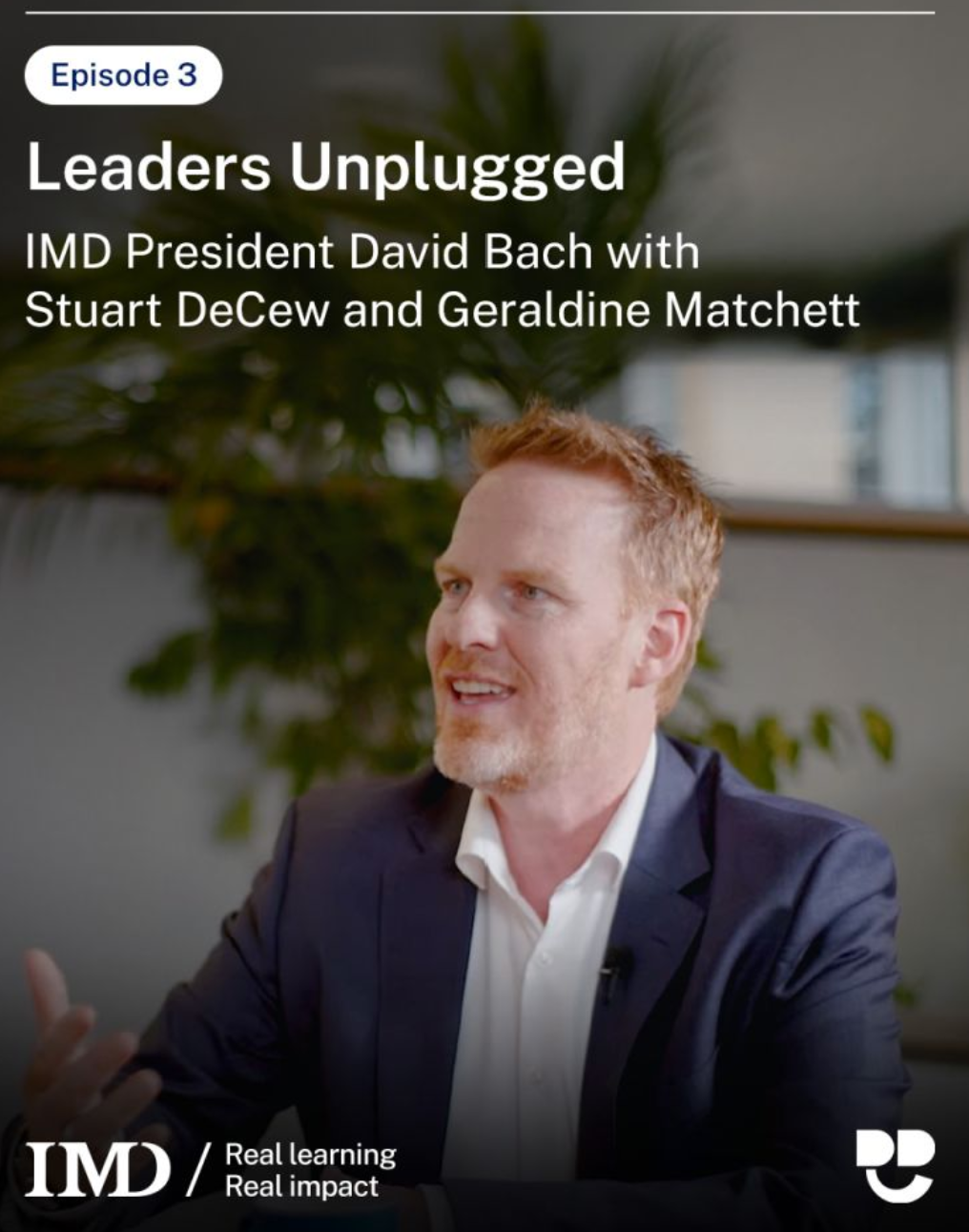 In the third episode of Leaders Unplugged IMD President David Bach sits down with sustainability leaders Geraldine Matchett, global board member at Nestlé, ABB, and SwissRe, and Chair of the steering committee of the influential Greenhouse Gas Protocol, and Stuart DeCew, Executive Director of the Yale Center for Business and the Environment and Lecturer at the Yale School of the Environment.